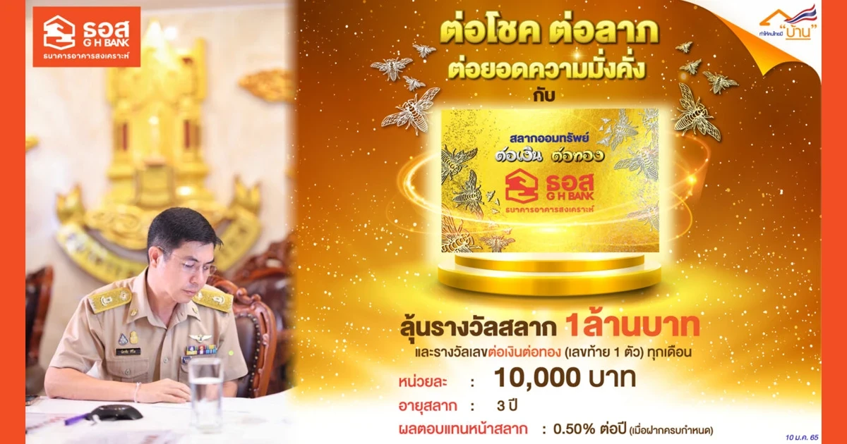 ธนาคารอาคารสงเคราะห์ (ธอส.) เอาใจคนรักการออมฉลองต้อนรับปีเสือ 2565 จัดทำสลากออมทรัพย์ ธอส. ชุดต่อเงินต่อทอง หน่วยละ 10,000 บาท จำนวน 20,000 ล้านบาท อายุสลาก 3 ปี ผลตอบแทนหน้าสลาก 0.50% ต่อปี ลุ้นรับรางวัลเป็นสลากออมทรัพย์ชุดต่อเงินต่อทองเพื่อนำไปลุ้นรางวัลได้อีกต่อ ฝากครบกำหนดได้รับเงินต้นและดอกเบี้ยรวมหน่วยละ 10,150 บาท เริ่มจำหน่ายตั้งแต่วันที่ 12 มกราคม 2565 เป็นต้นไป
