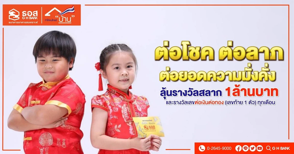 ธนาคารอาคารสงเคราะห์ เอาใจคนรักการออมที่กำลังมองหาของขวัญเพื่อมอบเป็นอั่งเปาให้ญาติผู้ใหญ่ หรือ บุตรหลาน เนื่องในโอกาสวันตรุษจีน ปี 2565 ด้วยสลากออมทรัพย์ ธอส. ชุดต่อเงินต่อทอง หน่วยละ 10,000 บาท อายุสลาก 3 ปี ผลตอบแทนหน้าสลาก 0.50% ต่อปี โดยผู้ซื้อมีสิทธิ์ลุ้นรางวัลตลอด 36 งวด เป็นสลากออมทรัพย์ชุดต่อเงินต่อทองเพื่อเพิ่มโอกาสในการถูกรางวัลมากขึ้น