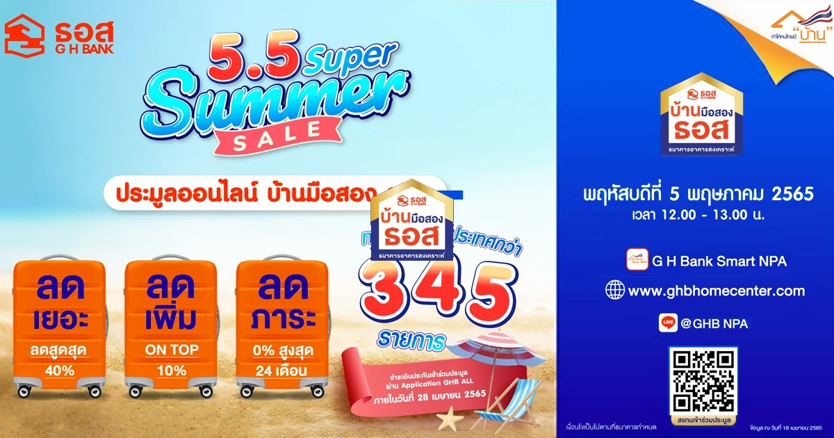 ธนาคารอาคารสงเคราะห์ จัดงานประมูลออนไลน์บ้านมือสอง ธอส. 5.5 Super Summer Sale ผ่าน Application : G H Bank Smart NPA คัดทรัพย์ใหม่คุณภาพดีทำเลเด่นรวมถึงเดินทางสะดวกมากมายรวมกว่า 354 รายการ ทั้งในพื้นที่กรุงเทพฯ และปริมณฑล รวมถึงทรัพย์ในส่วนภูมิภาค ด้วยราคาเริ่มต้นประมูลลดสูงสุดถึง 40% จากราคาปกติ ราคาต่ำสุดเพียง 130,000 บาทเท่านั้น