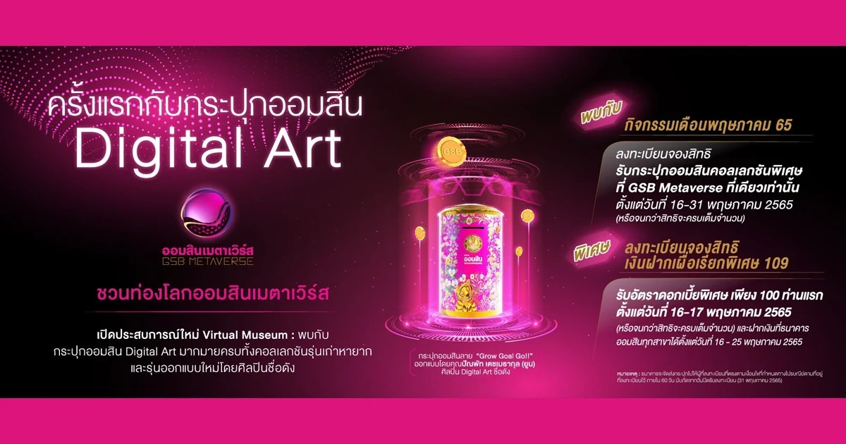 ออมสินยุคไฮเทค เปิดตัว "ออมสินเมตาเวิร์ส : GSB METAVERSE" ฉลองเฟสแรก จัดโปรเงินฝากเผื่อเรียกพิเศษ ดอกเบี้ยสูงสุด 10.90% เปิดให้จองสิทธิ์ 16 พ.ค. 65 แจกฟรี "กระปุกออมสิน Digital Art" รุ่นแรก และโปรโมชันมากมายบนโลกเสมือนจริง