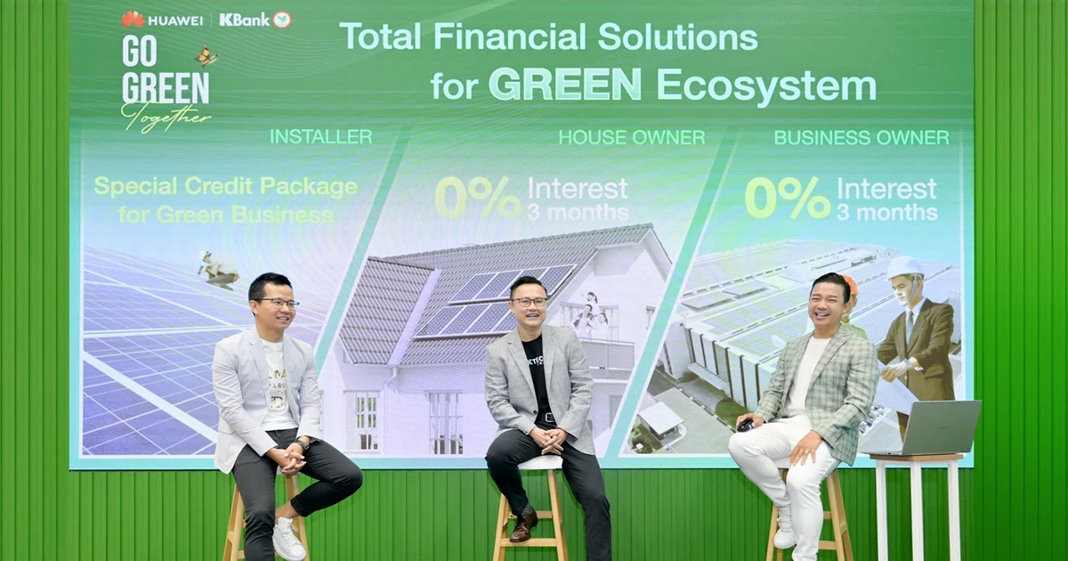 สำหรับความร่วมมือของธนาคารกสิกรไทยและหัวเว่ย ซึ่งเป็นผู้นำในตลาดดิจิทัลพาวเวอร์ และมีเครือข่ายผู้ติดตั้งหลังคาโซลาร์เซลล์ที่มีความเชี่ยวชาญสูง เป็นการร่วมมือกันสนับสนุน Green ecosystem ที่จะส่งมอบทั้งด้านการเงินและผลิตภัณฑ์นวัตกรรมให้แก่ผู้ใช้งานครบตั้งแต่ต้นน้ำถึงปลายน้ำ คือ ผู้รับเหมาติดตั้งหลังคาโซลาร์เซลล์ เจ้าของบ้าน และเจ้าของธุรกิจ เพื่อชวนให้ทุกคนมาร่วมกันรักษ์โลกและได้ประโยชน์จากการลดค่าไฟฟ้า โดยบ้านหนึ่งหลังจะลดค่าไฟได้ประมาณ 36,500 บาทต่อปี เมื่อติดตั้งหลังคาโซลาร์เซลล์ 5 kW