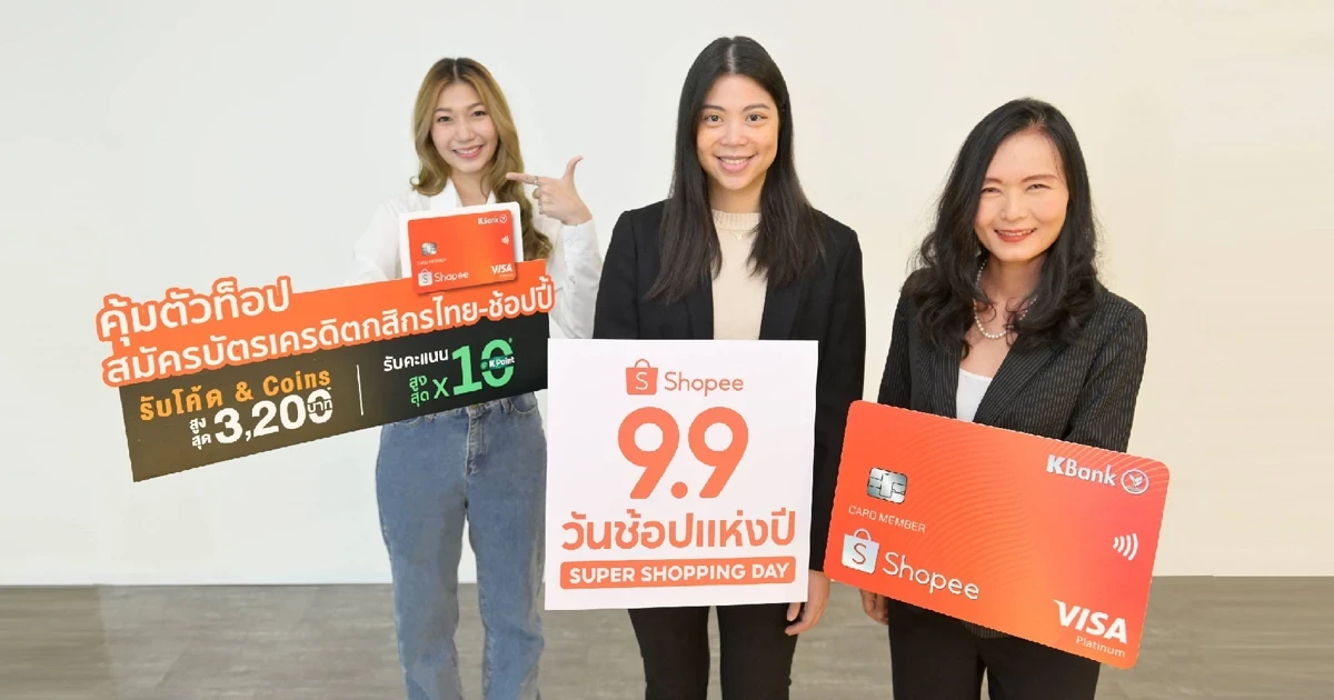 ธนาคารกสิกรไทย และ ช้อปปี้ (Shopee) ปลื้มความสำเร็จฉลองครบรอบ 2 ปี บัตรเครดิตกสิกรไทย-ช้อปปี้ ผนึกกำลังจัดดีล "คุ้มตัวท็อป" เพื่อตอกย้ำความคุ้มค่าให้แก่นักช้อปออนไลน์ โดยลูกค้าจะได้ช้อปจุใจกับ Shopee 9.9 วันช้อปแห่งปี : Super Shopping Day รับโค้ดส่วนลดสูงสุดถึง 9,999 บาท และโค้ดลดเพิ่มสำหรับการผ่อนชำระ พร้อมข้อเสนอสุดพิเศษสำหรับลูกค้าสมัครบัตรใหม่ รับโค้ดส่วนลดช้อปปี้ และ Shopee Coins รวมมูลค่าสูงสุดถึง 3,200 บาท