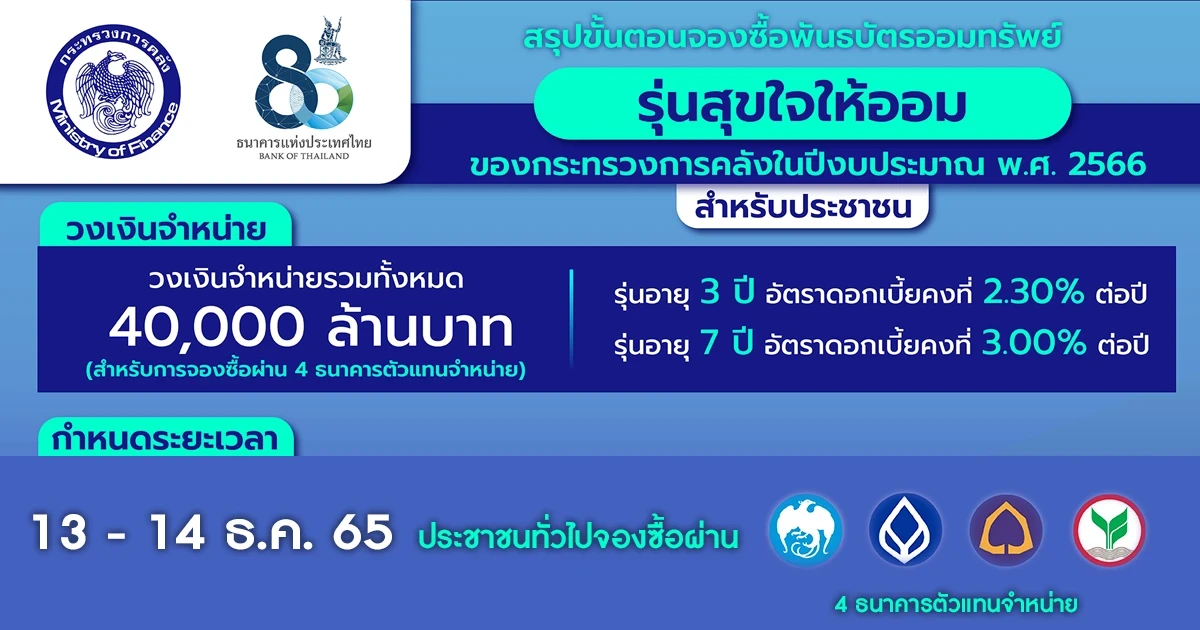 พันธบัตรที่จำหน่าย : พันธบัตรออมทรัพย์รุ่นสุขใจให้ออม ของกระทรวงการคลัง ในปีงบประมาณ พ.ศ. 2566 รุ่นอายุ 10 ปี (SB32DA) วงเงินจำหน่าย 5,000 ล้านบาท มูลค่าหน่วยละ 1,000 บาท
