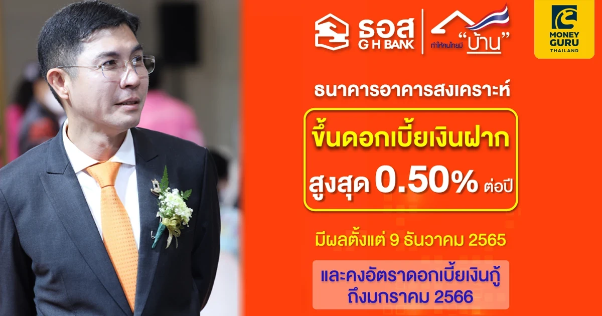 ธนาคารอาคารสงเคราะห์ ประกาศปรับขึ้นอัตราดอกเบี้ยเงินฝากประจำ และใบรับเงินฝากประจำ ประเภท 2 ปี 3 ปี และ 5 ปี 0.10 - 0.50% ต่อปี เพื่อให้สอดคล้องกับการปรับขึ้นอัตราดอกเบี้ยนโยบายของคณะกรรมการนโยบายการเงิน (กนง.) และสนับสนุนการออมของประชาชนให้ได้รับผลตอบแทนเพิ่มขึ้น โดยมีผลตั้งแต่วันศุกร์ที่ 9 ธันวาคม 2565 พร้อมคงอัตราดอกเบี้ยเงินกู้ไว้ในระดับเดิมอย่างน้อยถึงช่วงสิ้นเดือนมกราคม 2566