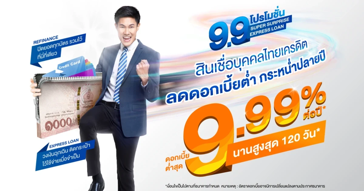 9.9 โปรโมชั่น สินเชื่อบุคคลไทยเครดิต ลดดอกเบี้ยต่ำ กระหน่ำปลายปี ดอกเบี้ยต่ำสุด 9.99% นานสูงสุด 120 วัน
