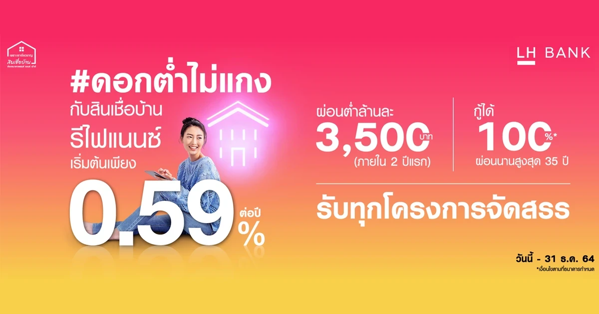 - สิทธิพิเศษสำหรับลูกค้า Refinance ดอกเบี้ยเริ่มต้น 0.59% ต่อปี สำหรับลูกค้าที่มีรายได้ตั้งแต่ 75,000 บาทต่อเดือนขึ้นไป หรืออัตราดอกเบี้ย 0.79% ต่อปี สำหรับลูกค้าที่มีรายได้ตั้งแต่ 20,000 บาทต่อเดือนขึ้นไป และเบิกรับเงินกู้ตั้งแต่วันที่ 1 ตุลาคม - 31 ธันวาคม 2564