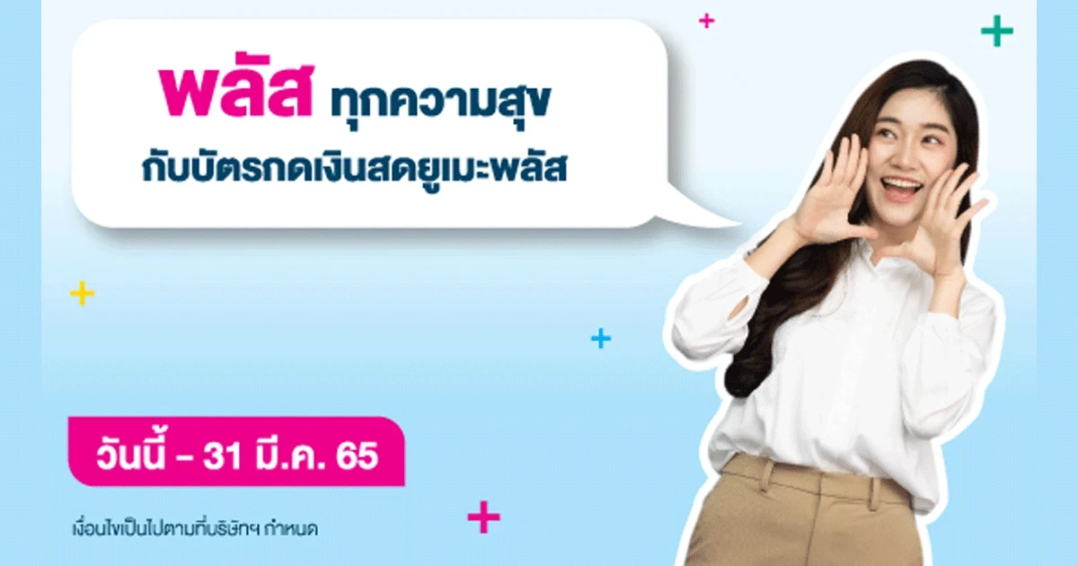 สิทธิประโยชน์ง่ายๆ ที่พลัสได้มากกว่า บัตรกดเงินสดจากยูเมะพลัส มีไว้ให้อุ่นใจกับสิทธิประโยชน์ง่ายๆ ได้ถึง 2 ต่อ สำหรับลูกค้าผู้สมัครบัตรกดเงินสดยูเมะพลัส ตั้งแต่วันนี้ จนถึงวันที่ 31 มีนาคม 2565 นี้เท่านั้น