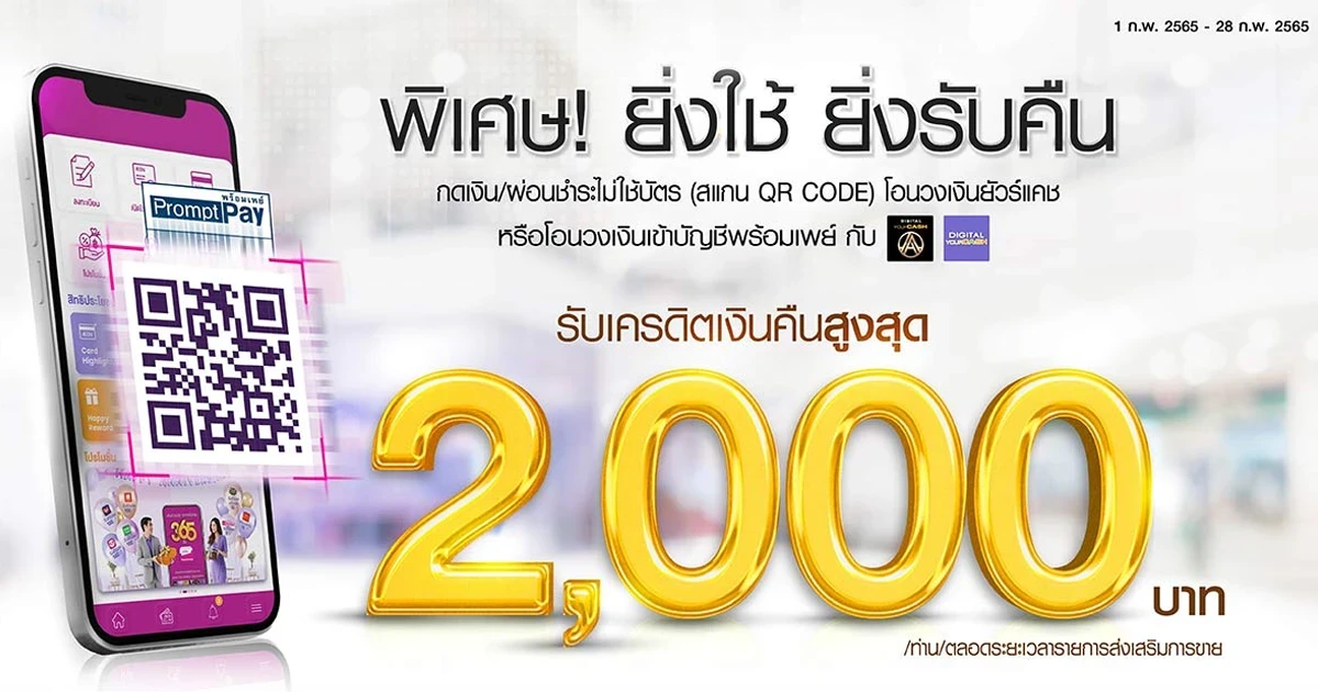 - รายการส่งเสริมการขายนี้ สงวนสิทธิ์เฉพาะผู้ถือบัตรสมาชิกอิออน, บัตรสมาชิกอิออนแรบบิท, บัตรสินเชื่อบิ๊กซี เอ็กซ์คลูซีฟ สินเชื่อดิจิตอลยัวร์แคช และสินเชื่อดิจิตอล ยัวร์แคช-เอ (บัตรสมาชิกฯ) ที่ออกโดยบริษัท อิออน ธนสินทรัพย์ (ไทยแลนด์) จำกัด (มหาชน) (“บริษัทฯ”) เมื่อใช้บริการเบิกถอนเงินสดผ่านสินเชื่อยัวร์แคช บริการผ่อนชำระสินค้าและบริการ AEON Happy Pay โดยไม่ใช้บัตร (สแกน QR CODE) โอนวงเงินยัวร์แคช หรือ โอนวงเงินเข้าบัญชีพร้อมเพย์ ผ่านวงเงินสินเชื่อยัวร์แคช ที่ออกโดยบริษัทฯ ระหว่างวันที่ 1 กุมภาพันธ์ 2565 - 28 กุมภาพันธ์ 2565