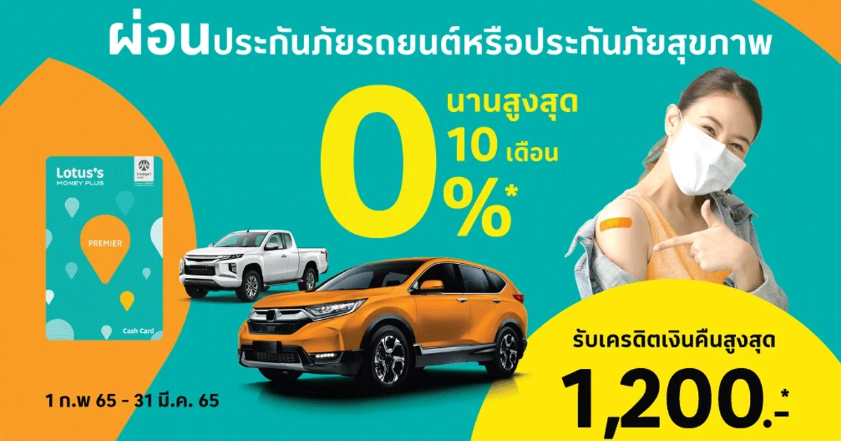 บัตรสินเชื่อโลตัส พรีเมียร์ผ่อนประกันภัยที่ร่วมรายการ 0%* นานสูงสุด 10 เดือน + รับเครดิตเงินคืนสูงสุด 1,200 บาท*/เดือน