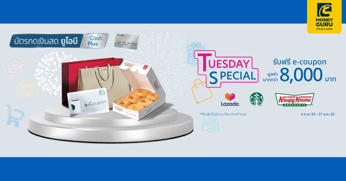 เมื่อทำรายการเบิกถอนเงินสดผ่านบัตรยูโอบี แคชพลัส (Cash Plus) ที่ตู้ ATM ของทุกธนาคารทั้งในและต่างประเทศ หรือผ่านสาขาธนาคารยูโอบี หรือผ่านแอปพลิเคชัน UOB TMRW เข้าบัญชีเงินฝากยูโอบี ในทุกวันอังคาร ระหว่างวันที่ 4 ตุลาคม 2565 – 31 ธันวาคม 2565 รับคูปองส่วนลด LAZADA และรับ Krispy Kreme ตามรายละเอียดที่ระบุในตารางด้านล่างนี้