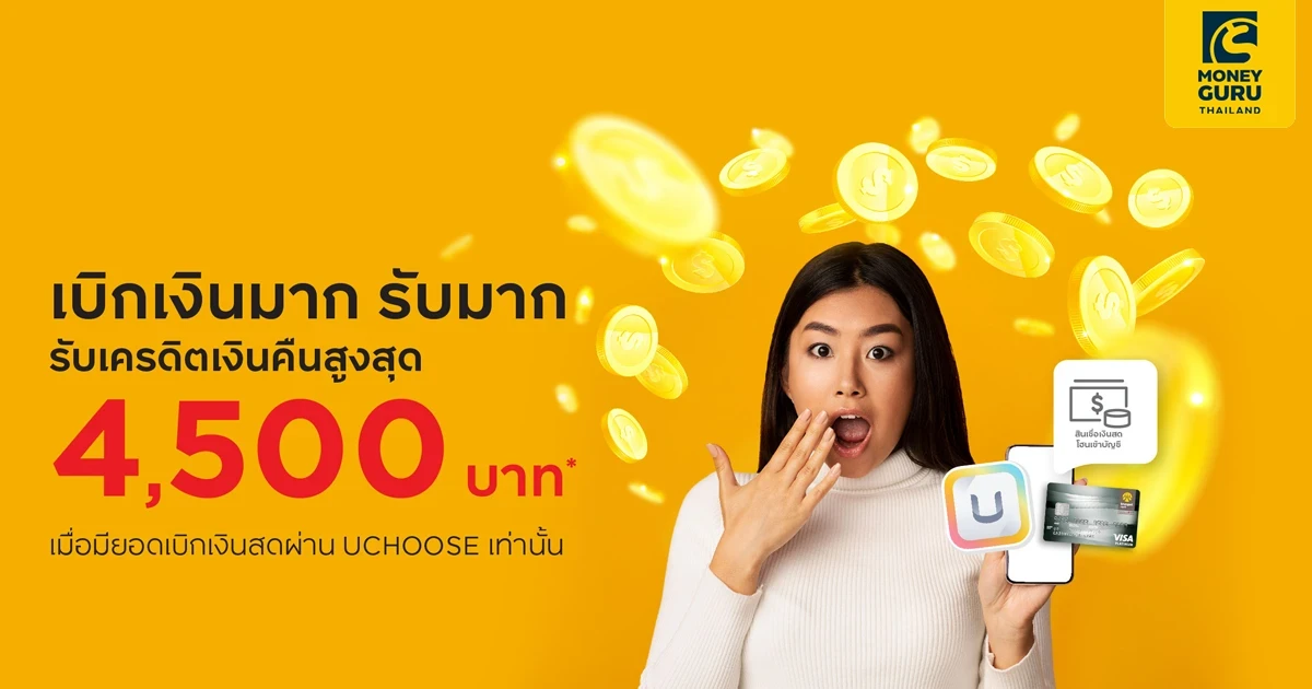 - บริษัทฯ ขอสงวนสิทธิ์การให้เครดิตเงินคืนเฉพาะสมาชิกบัตรเครดิต กรุงศรี ที่ใช้บริการเบิกถอนเงินสินเชื่อจากบัตรเครดิตกรุงศรีฯผ่านแอปพลิเคชั่น UCHOOSE เท่านั้น และมียอดการเบิกถอนเงินสดต่อรายการตามเงื่อนไขที่กำหนด (ยกเว้นรายการที่ถูกยกเลิก) ระหว่างวันที่ 1 พ.ย 65 – 31 ม.ค. 66 เท่านั้น
