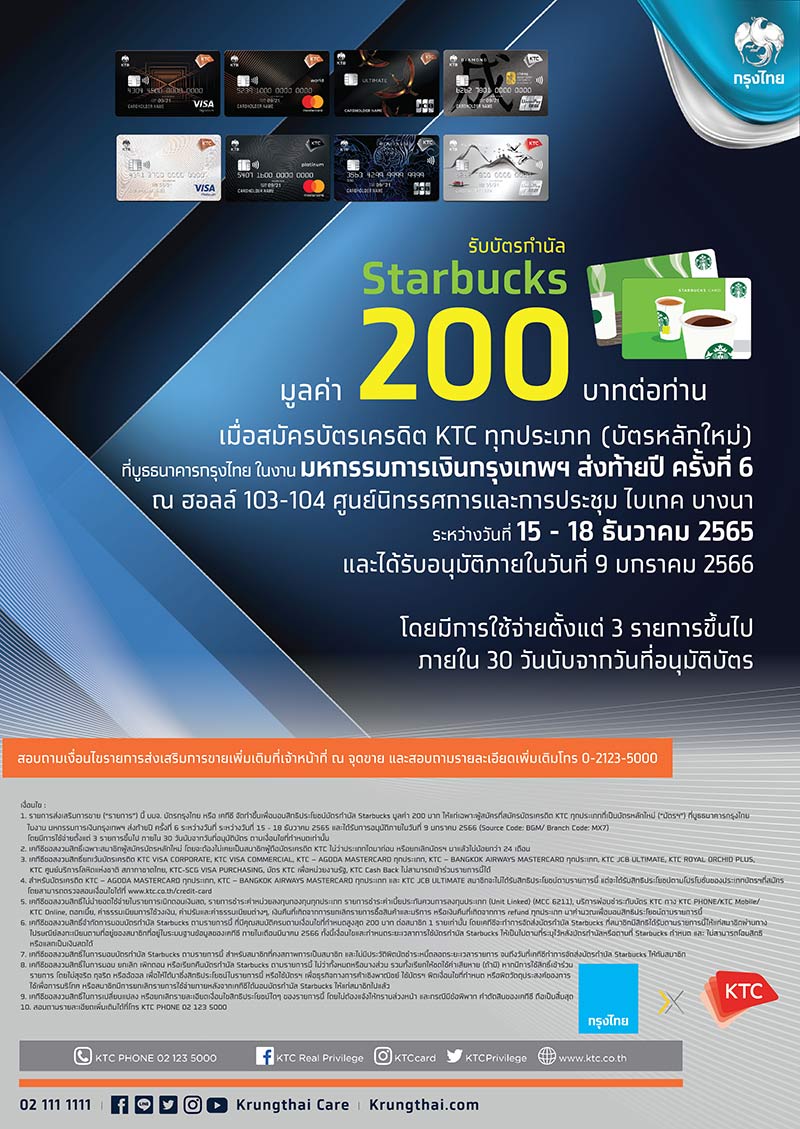 บัตรเครดิตกรุงไทย : รับบัตรกำนัล Starbucks มูลค่า 200 บาทต่อท่าน เมื่อสมัครบัตรเครดิต KTC ทุกประเภท ภายในงาน