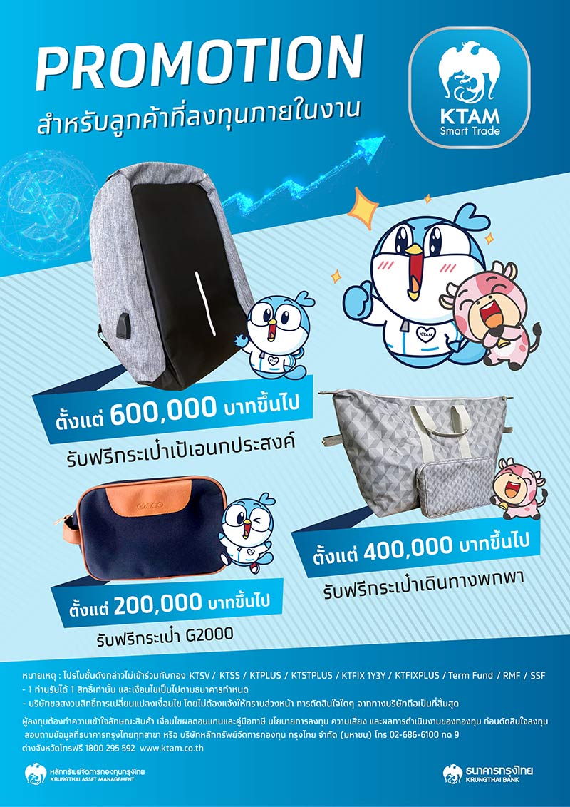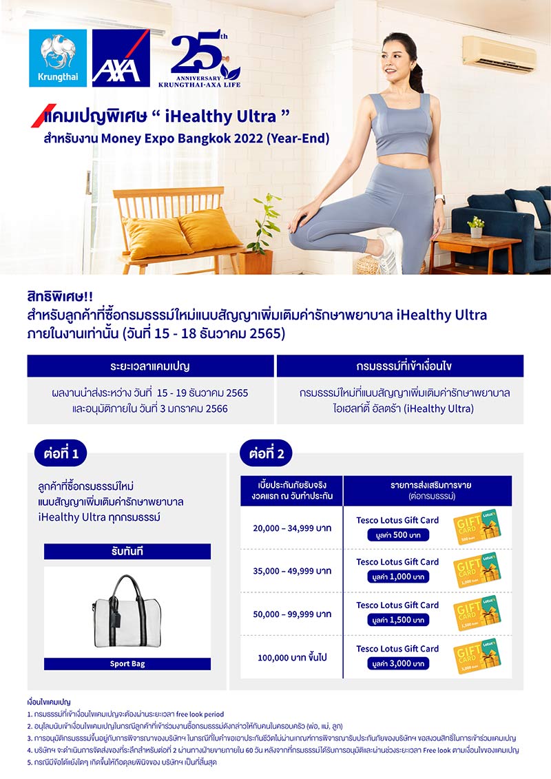 โปรโมชันพิเศษ กรุงไทย-แอกซ่า คาราวานตรวจสุขภาพ ณ บูธธนาคารกรุงไทย : กรมธรรม์ที่นำส่งและอนุมัติภายในวันที่ 15 ธ.ค. 65 - 18 ม.ค. 66 รับของที่ระลึกตามเงื่อนไข