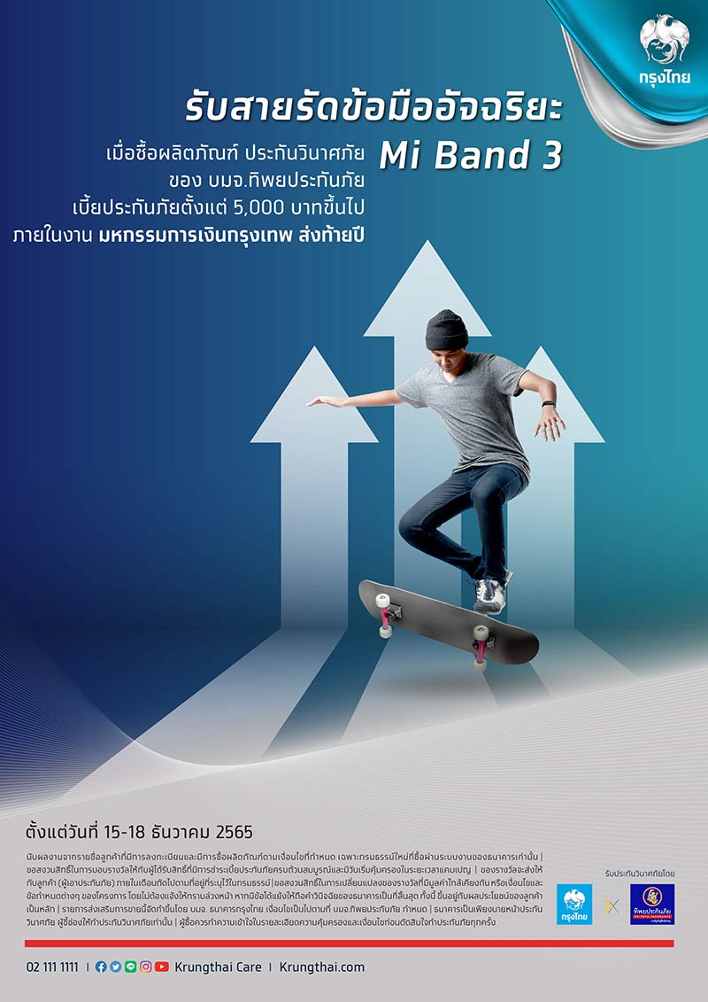 รับสายรัดข้อมืออัจฉริยะ Mi Band 3 เมื่อซื้อผลิตภัณฑ์ ประกันวินาศภัยของ บมจ. ทิพยประกันภัย เบี้ยประกันภัยตั้งแต่ 5,000 บาทขึ้นไป ภายในงาน Money Expo