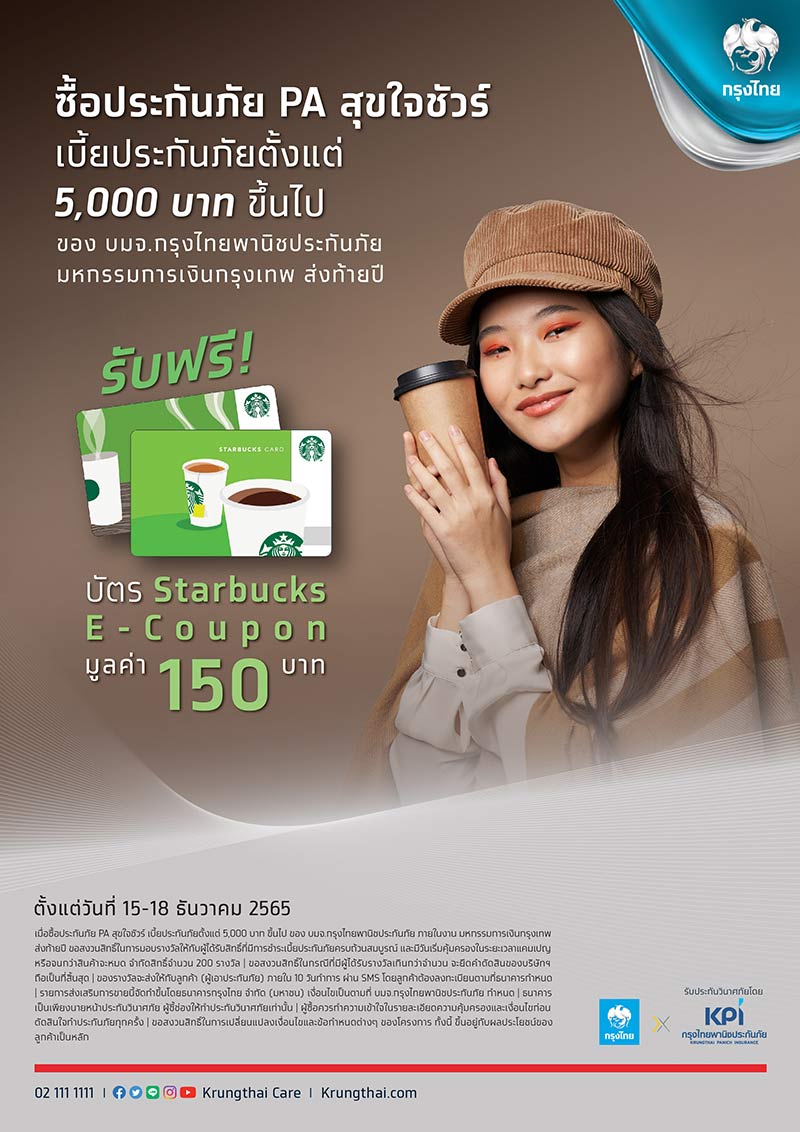 ซื้อประกันภัย PA สุขใจชัวร์ เบี้ยประกันภัยตั้งแต่ 5,000 บาทขึ้นไป ของ บมจ. กรุงไทยพานิชประกันภัย มหกรรมการเงินกรุงเทพ ส่งท้ายปี รับฟรี บัตร Starbucks E-Coupon มูลค่า 150 บาท