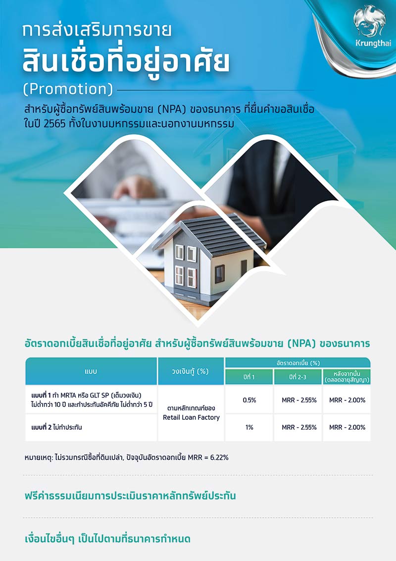 สินเชื่อที่อยู่อาศัย : สำหรับผู้ซื้อทรัพย์สินพร้อมขาย (NPA) ของธนาคาร ที่ยื่นคำขอสินเชื่อในปี 2565 ทั้งในงานมหกรรมและนอกงานมหกรรม รับอัตราดอกเบี้ยพิเศษ