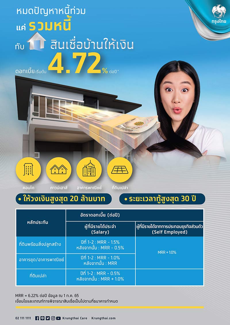 สินเชื่อบ้านให้เงิน : หมดปัญหาหนี้ท่วม แค่รวมหนี้ กับสินเชื่อบ้านให้เงิน ดอกเบี้ยเริ่มต้น 4.72% ต่อปี