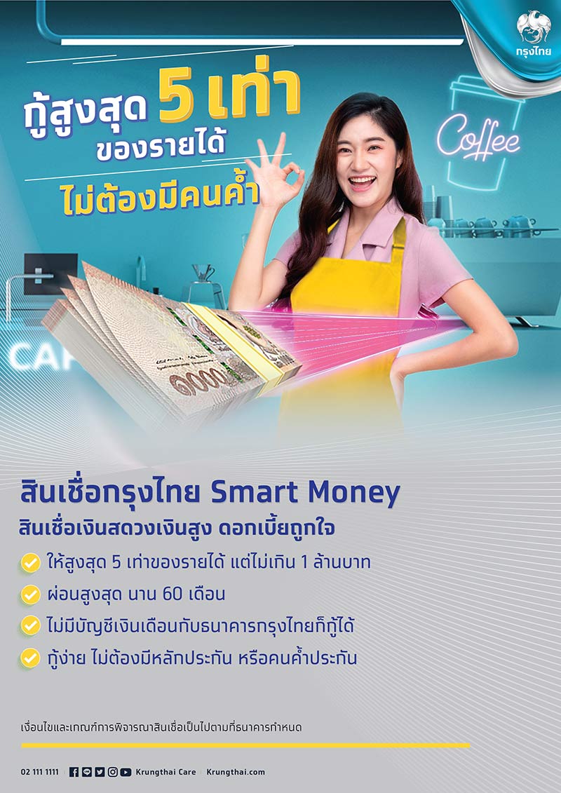 สินเชื่อกรุงไทย Smart Money : สินเชื่อเงินสดวงเงินสูง ดอกเบี้ยถูกใจ กู้สูงสุด 5 เท่าของรายได้ ไม่ต้องมีคนค้ำ