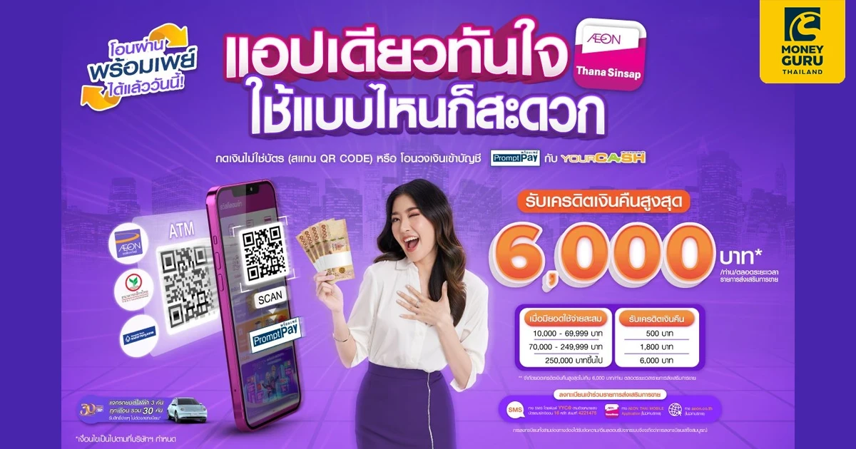 หมายเหตุ: วงเงินเบิกถอนเงินสด/โอนวงเงินเข้าบัญชีพร้อมเพย์เป็นไปตามวงเงินที่ได้รับอนุมัติจากบริษัทฯ ยอดที่ผู้ถือบัตรสามารถเบิกถอนเงินสดได้ ขึ้นอยู่กับวงเงินคงเหลือในบัญชี โดยวงเงินสำหรับเบิกถอนเงินสด/โอนวงเงินเข้าบัญชีพร้อมเพย์อาจมีการเปลี่ยนแปลงขึ้นอยู่กับประวัติการชำระเงิน - บริษัทฯ สงวนสิทธิ์การให้เครดิตเงินคืน เฉพาะลูกค้าที่ทำรายการ เบิกถอนเงินสดโดยไม่ใช้บัตร(ผ่านการสแกน QR CODE) หรือ โอนวงเงินเข้าบัญชีพร้อมเพย์ เท่านั้น ลูกค้าที่ทำรายการโดยใช้บัตร และ/หรือ บริการ อิออน แฮปปี้ เพย์ (AEON Happy Pay) บริการผ่อนชำระสินค้าวงเงินสินเชื่อยัวร์แคช โดยใช้บัตรและการแสกน QR CODE ไม่สามารถรวมยอดกับการใช้บริการเบิกถอนเงินสด ผ่านรายการส่งเสริมการขายนี้ได้