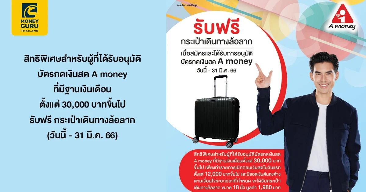 สิทธิพิเศษสำหรับผู้ที่ได้รับอนุมัติบัตรกดเงินสด A money ที่มีฐานเงินเดือนตั้งแต่ 30,000 บาทขึ้นไป เพียงทำรายการเบิกถอนเงินสดในวันแรกตั้งแต่ 12,000 บาทขึ้นไป และมียอดเงินต้นคงค้างตามเงื่อนไขระยะเวลาที่กำหนด จะได้รับกระเป๋าเดินทางล้อลากขนาด 18 นิ้ว มูลค่า 1,980 บาท