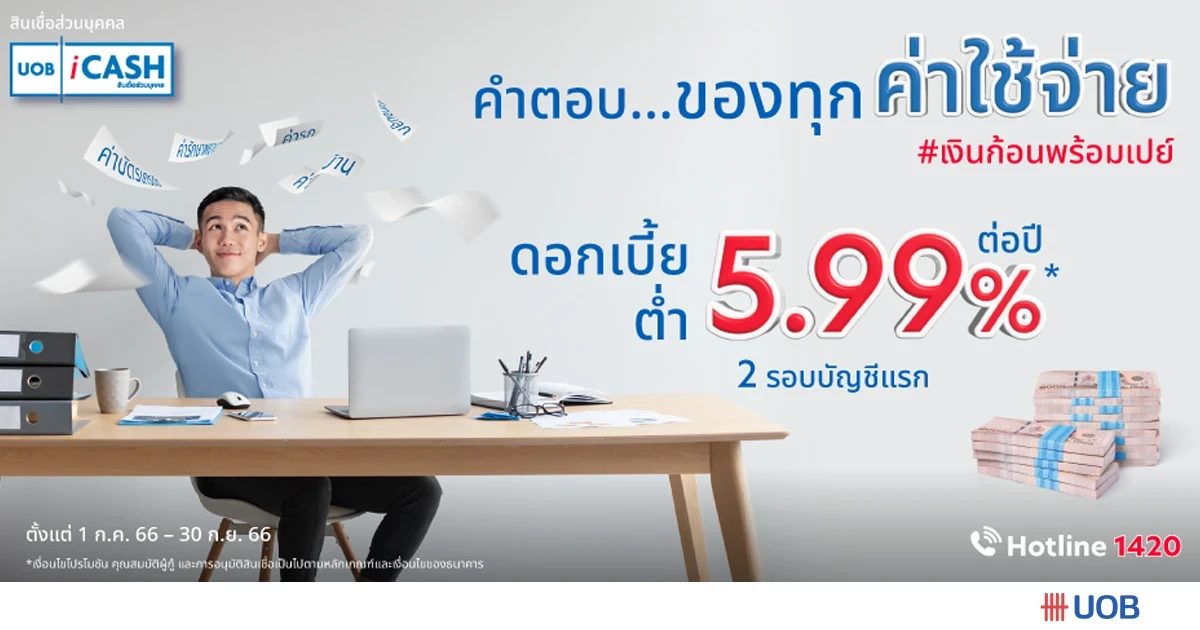 - สำหรับลูกค้าที่สมัครผ่านช่องทางออนไลน์ และได้รับอนุมัติสินเชื่อ UOB iCASH ระหว่างวันที่ 17 ก.ค. 66 – 31 ส.ค. 66 เท่านั้น