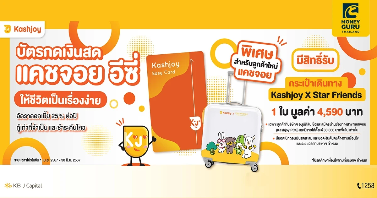 - บริษัทฯ ขอสงวนสิทธิ์สำหรับผู้ที่มีสิทธิ์รับของสมนาคุณกระเป๋าเดินทางแคชจอย สตาร์เฟรนด์ (Kashjoy X Starfriends Luggage) เฉพาะลูกค้าที่มีรายได้ตั้งแต่ 30,000 บาท/เดือนขึ้นไป เท่านั้น