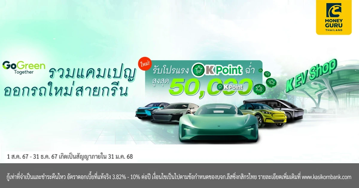 K EV Shop จาก KLeasing ผู้นำด้านสินเชื่อรถยนต์ไฟฟ้า รวมดีลเด็ดจัดไฟแนนซ์รถยนต์ไฟฟ้าใหม่ (EV) มอบข้อเสนอพิเศษจัดเต็ม ดอกเบี้ยถูก รู้ผลอนุมัติไว สมัครวันนี้ รับโปรแรง! K Points สูงสุด 50,000 K Points (หลังอนุมัติสัญญาแล้ว)