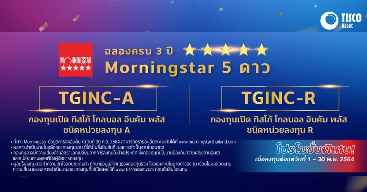 - สงวนสิทธิ์สำหรับลูกค้าบุคคลธรรมดาที่ลงทุนในกองทุนTGINC-A และ/หรือ TGINC-R ตั้งแต่วันที่ 1 - 30 พ.ย. 64 ผ่าน TISCO My Funds เท่านั้น โดยยอดเงินลงทุนรวมทุกๆ 50,000 บาท จะได้รับหน่วยลงทุนกองทุนเปิด ทิสโก้ พันธบัตรระยะสั้น ("TISCOSTF") มูลค่า 100 บาท สูงสุด 2,000 บาท