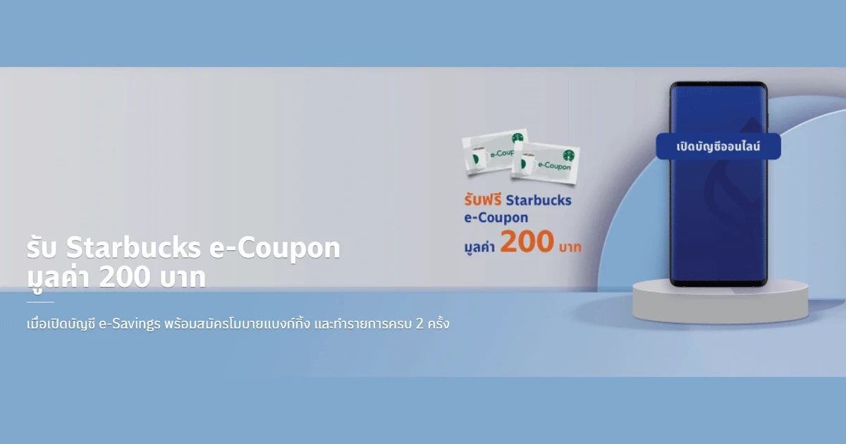 โปรดี ไม่มีกั๊ก เมื่อเปิดบัญชี e-Savings พร้อมสมัครโมบายแบงก์กิ้ง จากธนาคารกรุงเทพ และทำรายการครบ 2 ครั้ง รับ Starbucks e-Coupon มูลค่า 200 บาท*