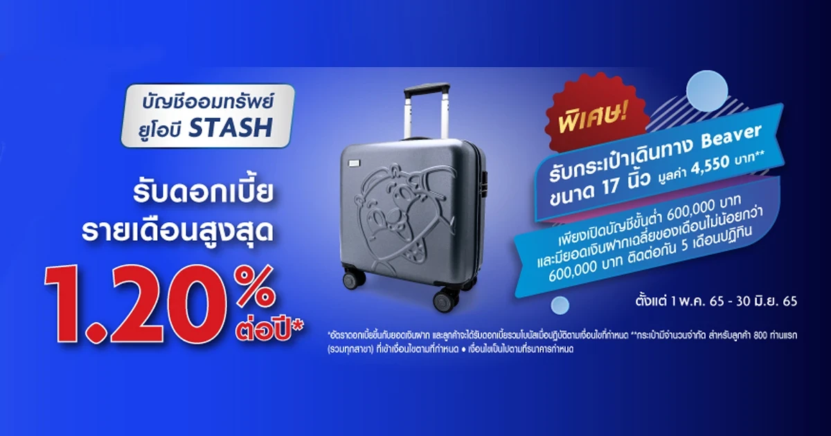 - เปิดบัญชี UOB STASH พร้อมฝากเงินขั้นต่ำ 600,000 บาท ระหว่างวันที่ 1 พ.ค. 65 – 30 มิ.ย. 65 และมียอดเงินฝากเฉลี่ยไม่น้อยกว่า 600,000 บาท ติดต่อกัน 5 เดือนปฏิทิน โดยเริ่มนับเดือนที่เปิดบัญชีเป็นเดือนแรก ลูกค้าจะได้รับกระเป๋าเดินทาง Beaver ขนาด 17 นิ้ว มูลค่า 4,550 บาท จำนวน 1 ใบ