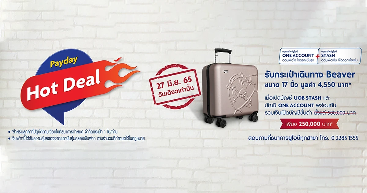 รับกระเป๋าเดินทาง Beaver ขนาด 17 นิ้ว* เมื่อเปิดบัญชีออมทรัพย์ UOB ONE ACCOUNT และบัญชีออมทรัพย์ UOB STASH พร้อมกัน ในวันที่ 27 มิ.ย. 65 รวมยอดเงินเปิดบัญชีขั้นต่ำ 250,000 บาท โดยแต่ละบัญชีไม่ต่ำกว่า 10,000 บาท พร้อมคงยอดเงินฝาก ติดต่อกัน 5 เดือนปฏิทิน