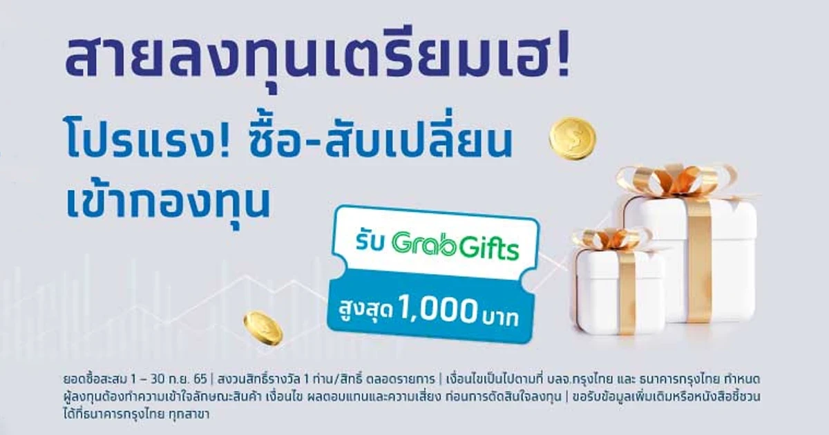 - สำหรับยอดซื้อ –สับเปลี่ยนเข้ากองทุน 200,000 บาทขึ้นไป ธนาคารจะส่ง Grab Gifts หรือ บัตรกำนัลอิเล็กทรอนิกส์ประเภทอื่นที่มีมูลค่าเทียบเท่าให้กับลูกค้า ภายใน 60 วัน นับจากวันสิ้นสุดโครงการ ผ่านทาง Line Krungthai Connext เท่านั้น (ดูรายละเอียดและสมัครบริการ Line Krungthai Connext ได้ที่ https://krungthai.com/th/content/personal/krungthai-connext)