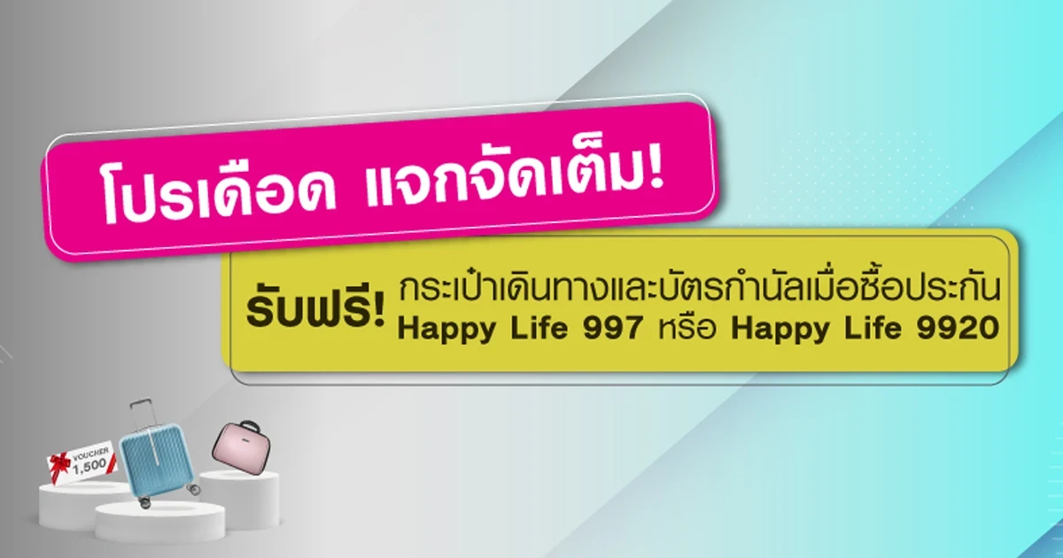 โปรเดือด แจกจัดเต็ม! รับฟรี กระเป๋าเดินทาง และบัตรกำนัลเมื่อซื้อประกัน HAPPY LIFE 997 หรือ HAPPY LIFE 9920 และชำระเบี้ยประกันแบบรายปี