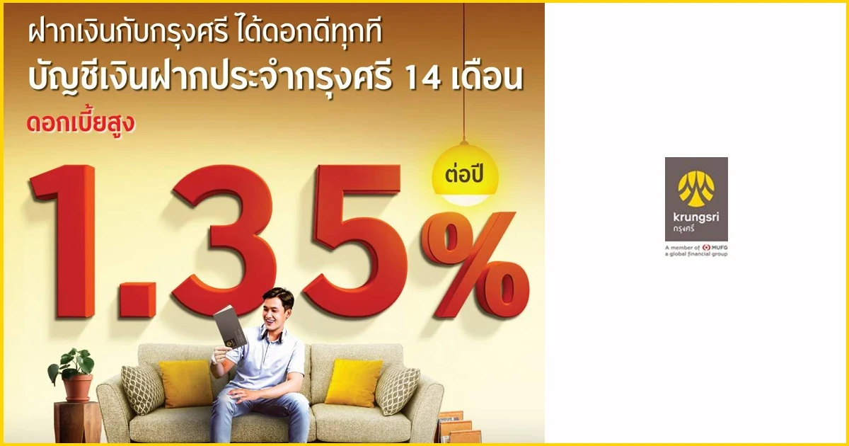 ฝากเงินกับกรุงศรี ได้ดอกดีทุกที กับบัญชีเงินฝากประจำ 14 เดือน สำหรับลูกค้าบุคคลธรรมดา และนิติบุคคลไม่แสวงหากำไร รับดอกเบี้ยเมื่อครบกำหนดระยะเวลาฝาก