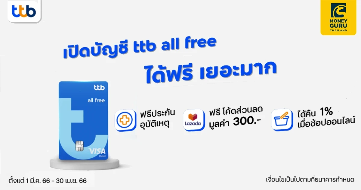 - ลูกค้าที่ได้รับสิทธิ์ต้องเป็นลูกค้าใหม่ ที่ยังไม่เคยมีบัญชี ttb all free มาก่อน และฝากเงิน 5,000 บาทในวันที่เปิดบัญชี โดยลูกค้าสามารถเข้าร่วมโปรโมชันได้ เมื่อเปิดบัญชีผ่านสาขา หรือ ttb touch
