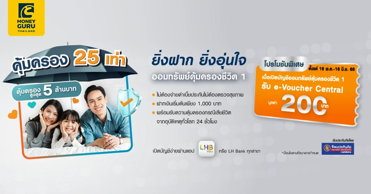 - สิทธิพิเศษนี้ สำหรับลูกค้าใหม่ (ลูกค้าที่ไม่เคยมีผลิตภัณฑ์ใดๆ กับธนาคาร และลูกค้าที่มีผลิตภัณฑ์ทางการอื่นกับธนาคาร แต่ไม่เคยมีบัญชีออมทรัพย์คุ้มครองชีวิต 1) ของธนาคารที่เปิดบัญชีธนาคารแลนด์ แอนด์ เฮ้าส์ จำกัด (มหาชน) ประเภทออมทรัพย์คุ้มครองชีวิต 1 สมัครผ่านช่องทางสาขา และ LHB YOU Application (คุ้มครอง 25 เท่าของเงินฝาก และวงเงินสูงสุด 5 ล้านบาท) เปิดบัญชี 1,000 บาทขึ้นไป (ตามเงื่อนไขของผลิตภัณฑ์) รับคูปองส่วนลด Central e-Voucher 200 บาท ตั้งแต่วันที่ 16 พฤษภาคม พ.ศ. 2566 เวลา 00.00 น. - วันที่ 16 มิถุนายน พ.ศ. 2566 เวลา 23.59 น. เท่านั้น