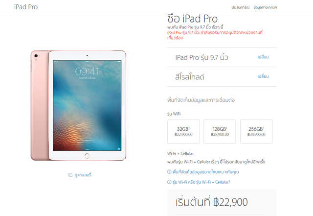 Apple iPad Pro 9.7 จะมาพร้อมสีเงิน ทอง เทาสเปซเกรย์ และโรสโกลด์ให้เลือก โดยมีการกำหนดราคาไว้เริ่มต้นที่ 22,900 บาท ส่วนจะเริ่มวางจำหน่ายในไทยอย่างเป็นทางการเมื่อไหร่นั้น ถ้าเราทราบ จะรีบมารายงานโดยด่วน!